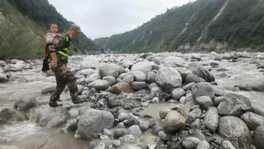 四川省甘孜军分区9月7日上午10时派出民兵前往泸定县磨西镇共和村开展救援工作,在发现5名群众和4名儿童被困后,救援民兵立即背起儿童跨河转移。同时,甘孜军分区还组织民兵继续进村入户排查险情、转移受灾群众,帮助群众抢救家禽家畜。