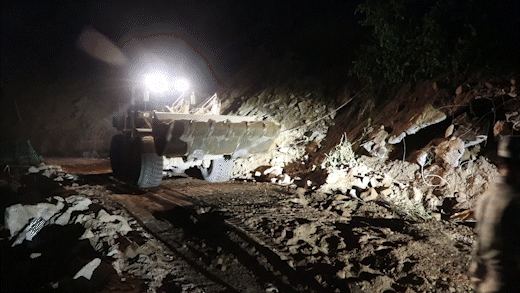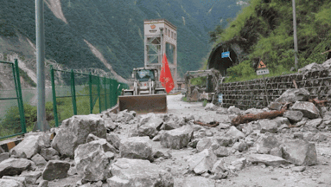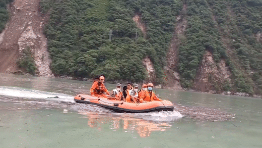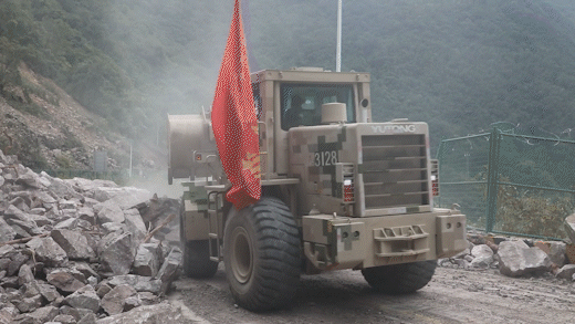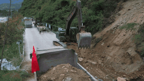 地震造成泸定县多处山体滑坡,加之余震频发引发大量碎石滚落,部分道路变窄、通行不畅。武警第二机动总队某支队官兵充分发挥交通专业部队优势,现地勘察道路情况,动用挖掘机、装载机、起重机等工程机械,对磨西、得妥、冷碛等地省道进行排险、抢通和拓宽。同时,该支队协助泸定公安部门,吊装2艘冲锋舟用于完成大渡河流域受灾群众转移任务。