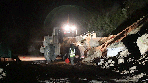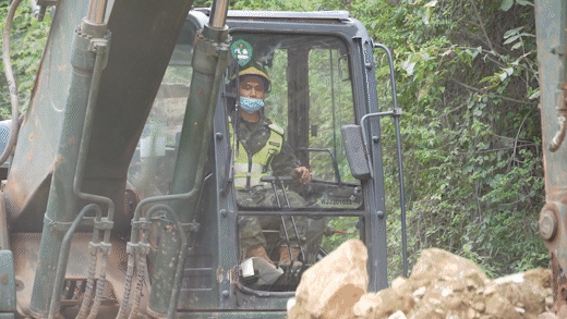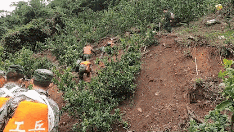 在雅安市石棉县,因余震不断,接近震中的石棉县王岗坪乡挖角村附近211省道附近发生大规模山体滑坡,造成主要救援道路交通中断。第77集团军某工兵旅调用挖掘机、装载机、破碎锤等大型救援装备,昼夜连续展开道路抢通任务,确保以最快速度打通“陆地生命线”。官兵已连续作业48小时,协助地方力量共疏通17处塌方。
