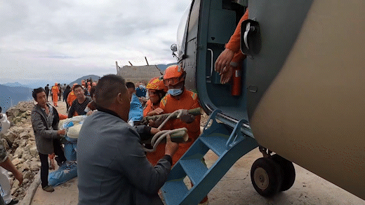 除了地面救援和道路抢通外,空中的生命接力也在进行。第77集团军某陆航旅9月7日继续出动2架运输直升机承担灾区伤员转运任务。在被称为“孤岛”的泸定县磨西镇柏秧坪村3组,救援机组为村民们送来急需的饮用水、干粮等物资,并将86岁高龄、腿部受伤的倪明清老人和其他伤员及时转运到后方。得知海螺沟有一名孕妇即将临产后,机组人员迅疾研究飞行航线,在地面救援武警的协助下,机组人员和随行的县医院医生成功将孕妇转送至泸定县的医疗机构。