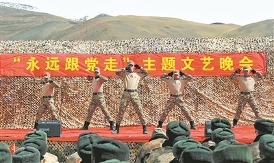 在党的二十大开幕之际,新疆军区某部文艺小分队走进海拔4500多米的昆仑山腹地,用一个个主题鲜明的文艺节目表达“永远跟党走”的坚定信念。