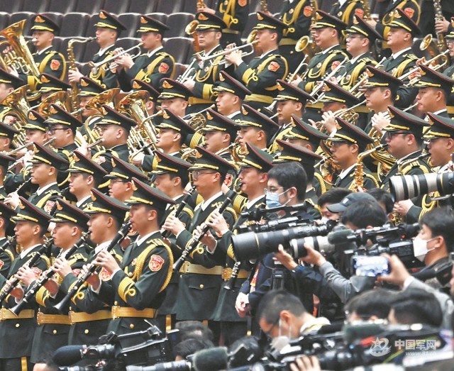 10月22日,中国共产党第二十次全国代表大会在北京人民大会堂胜利闭幕。图为军乐团在大会现场演奏。解放军报记者 穆瑞林摄
