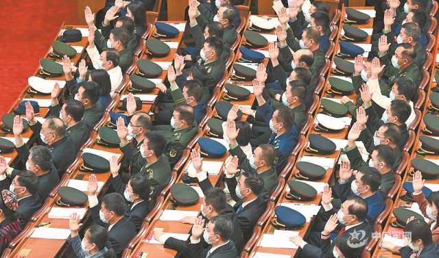 10月22日,中国共产党第二十次全国代表大会闭幕会在北京人民大会堂举行。图为代表们举手表决。解放军报记者 穆瑞林摄