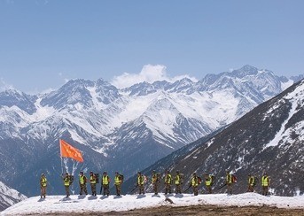 初夏时节,远处高山上仍蒙着积雪。四川省汶川县卧龙镇武装部副部长沈原平带领民兵应急排的民兵们在一处山脚整齐列队。他们将执行为期6天的巡山任务。
