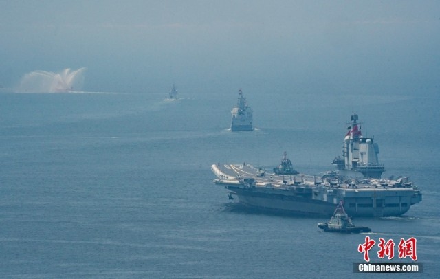 7月7日,中国人民解放军海军山东舰航母编队结束为期5天的访问,驶离香港特区。图为航空母舰山东舰(近端)、导弹驱逐舰延安舰(中右)编队通过东博寮海峡。