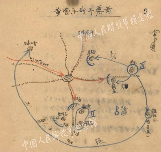 一九四三年新四军司令部《盐阜分区反扫荡战役详报》内页之黄营子战斗要图。