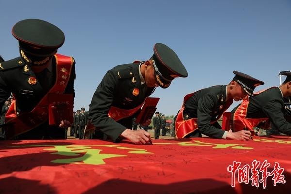 9月15日,塞北某野外驻训场,“新时代刘老庄八十二勇士”颁授仪式现场,被评为“新时代刘老庄八十二勇士”的11位官兵依次在勇士旗上签名。