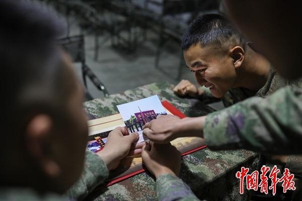9月13日晚,塞北某野外驻训场,“刘老庄连”战士王熙炜(右一)在观看连队里参加纪念中国人民抗日战争暨世界反法西斯战争胜利80周年阅兵式的战友拍摄的合影。