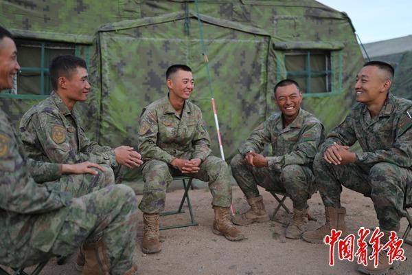 9月14日,塞北某野外驻训场,“刘老庄连”的周一凡(左一)、易志宏(左二)、李柄璋(左三)、朱肖杰(右二)、王麟虎(右一)在帐篷旁聊天分享这一年彼此的生活。他们都是去年9月入伍的同年兵,军旅生活刚满1年。这一年,他们之中有人参加了九三阅兵,有人代表连队登上《感动中国》的舞台,有人在提前选晋考核中名列前茅,晋升了军士。