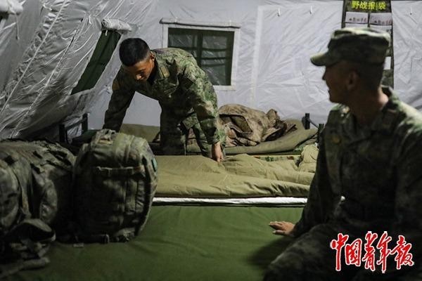 9月13日晚,塞北某野外驻训场的帐篷内,“刘老庄连”两名战士在休息时聊天。