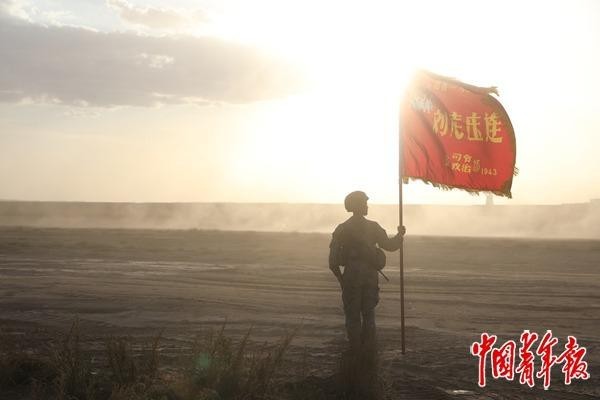 9月12日,塞北某野外驻训场,夕阳下“刘老庄连”官兵高举“刘老庄连”荣誉旗帜。