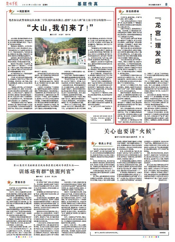 “老王手艺高超,这间‘龙宫’理发店越来越热闹了!”小张起身一看,已有几名战友在排队。这间“理发店”,其实就是在狭窄过道一个空角落放了一张凳子,既方便大家坐着理发,也不影响人员通过。
