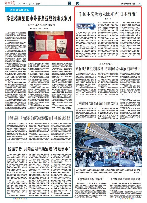 历史与现实充分证明,军国主义余毒未除才是真正的“日本有事”。从发动侵华战争造成超3500万中国军民伤亡,到袭击珍珠港引发太平洋战争,日本军国主义不仅给世界人民造成深重灾难,也把本国拖入战争泥潭,使日本成为唯一遭受原子弹轰炸的国家。日本军国主义军事扩张史,也是回旋镖不断刺向自身的毁灭史。如今,日本右翼政客逆国际大势而动,不仅在历史问题上大开倒车,还冒天下之大不韪借台湾生事,更大幅提升防卫预算、发展远程攻击能力、试图修改“无核三原则”,大有复军国主义亡魂之势。对于这一动向,国际社会必须始终保持高度警惕。