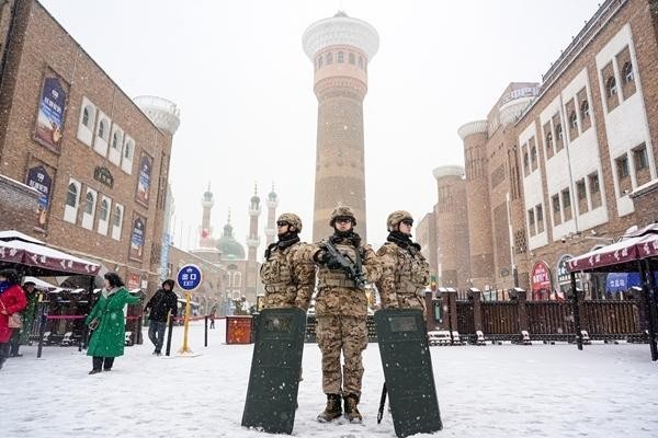 在大巴扎门口,一座写着“首府卫士”的岗台上,伫立着武警新疆总队某支队防暴巡逻车四中队官兵,他们身姿挺拔、紧握钢枪,身上落满了雪花,从远处看仿佛与雪景融为一体,与路边闪着警灯的防暴巡逻车交相辉映,默默守护着城市的繁荣与安宁。中队常态担负大巴扎区域联勤武装巡逻勤务,先后荣立集体一等功1次、集体三等功1次,涌现出“献身使命的忠诚卫士”万金刚、“维稳勇士”姜兴卫等一批先进典型,2024年9月被中共中央、国务院评为“全国民族团结进步模范集体”。
