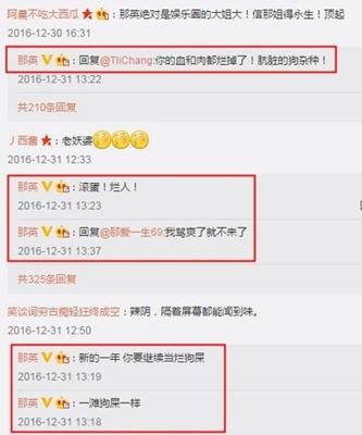 那英在微博晒出王菲演唱会“幻乐一场”海报,写到:“必须不紧张啊!”酸民们展开攻击,留言“老妖婆”、“辣阴,隔着荧幕都能闻到味”等,那英回复“滚蛋!烂人”;“新的一年,你要继续当烂狗屎”,她还标注酸民,有些人吓到删文,版面只留下她回呛:“你的血和肉都烂掉了!肮脏的狗杂种!”