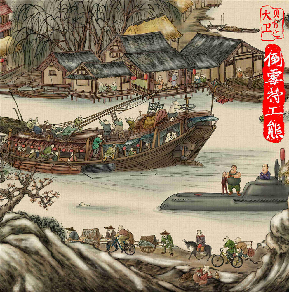 今日曝光的“群熊戏春”图别具匠心,采用了传统水墨画的表现手法,浓浓的中国风扑面而来,更有不少有趣的元素蕴藏其中。贝肯领衔群熊穿越至古意盎然的山水画中,身穿古代服饰形态各异,重现了昔日集市的繁华景象,通过河两岸风土人情和自然风光的精准刻画,将一片安居乐业的和谐氛围生动地呈现在大家面前。与周围环境形成鲜明对比的是,以黑眼为首的大反派隐藏在角落里作恶多端,总统和下属们的出现也颇为突兀,驾驶着潜水艇欲破坏这一切平静的生活。