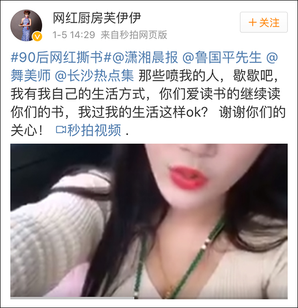 该条微博配上的视频中,“芙伊伊”还说到,“那些网络上的喷子你们有什么资格说我啊?我没读书还不是一样的可以开跑车,背LV的包包,还限量版的呢。至于粉丝送我的东西,我爱怎么招就怎么招,撕了又怎么样,下次送给我我还是一样的会撕。我觉得没读书一样可以过很好的生活啊,还是可以去大学里演讲啊,上课啊,所以说,这也没什么好说的。”