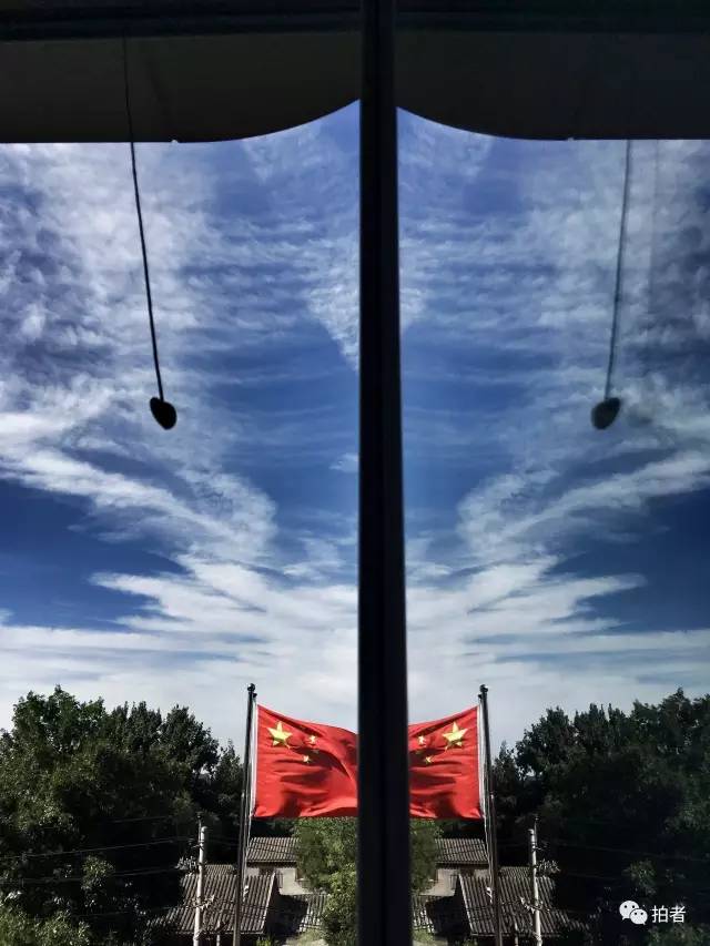 ▲ 2016年8月31日,东四。蓝天、白云和红旗在玻璃上形成了一张脸谱。摄影/新京报记者浦峰