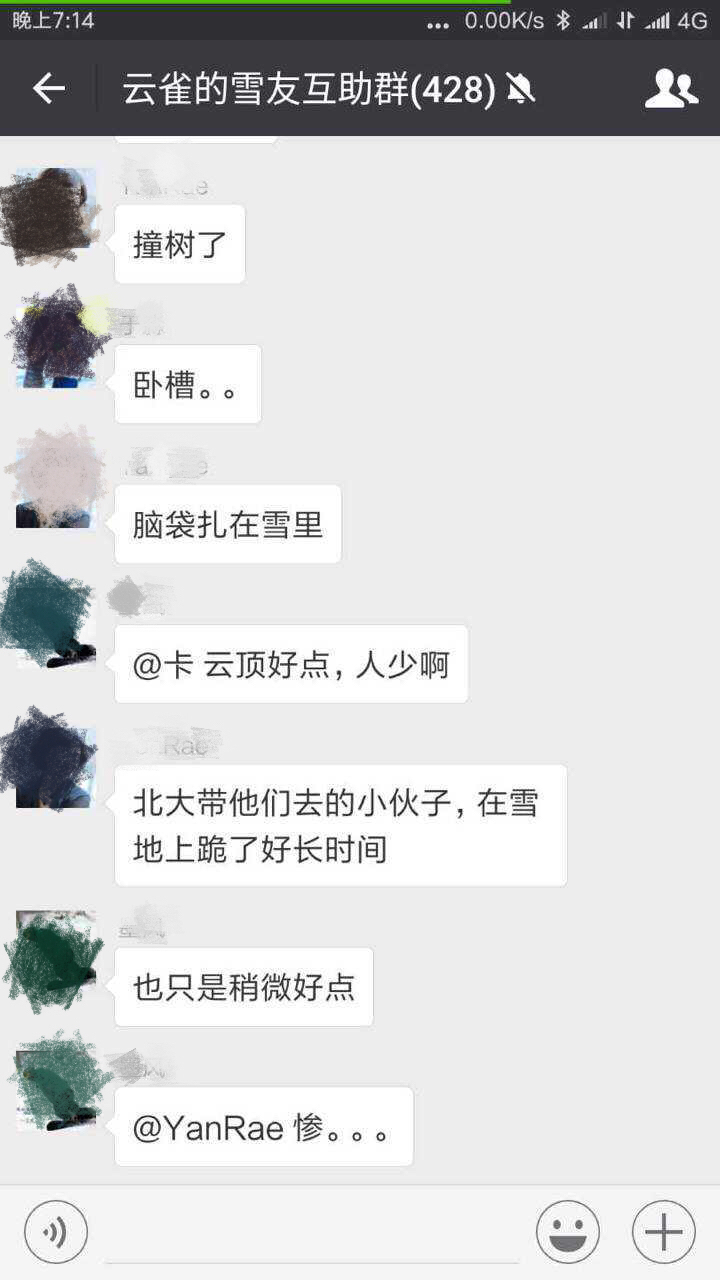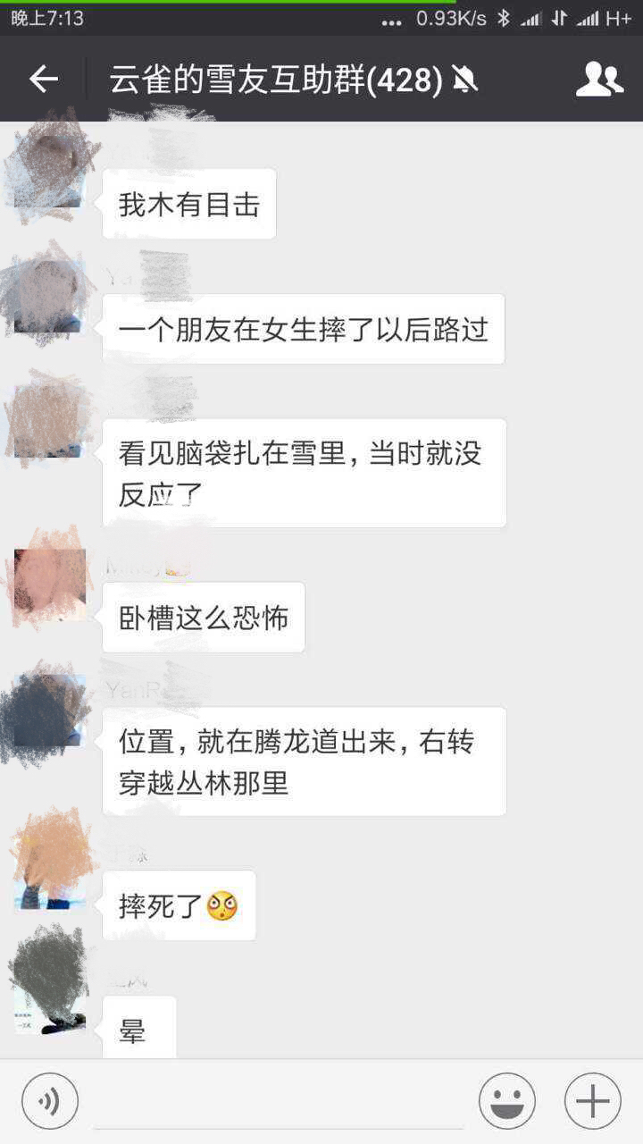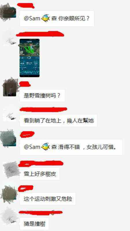 京华时报记者在百度贴吧单板滑雪吧内搜帖发现,一位网名为“天使之王47”的网友于1月17日中午发帖称“万龙雪场腾龙道发生一名北大硕士滑雪撞树的事故”,并上传了多张名称为“云雀的雪友互助群”的群聊截图,聊天记录中显示“撞树了”、“脑袋扎在雪里”、“雪上好多树皮”、“位置,就在腾龙道出来,右转穿越丛里那里”等描述。