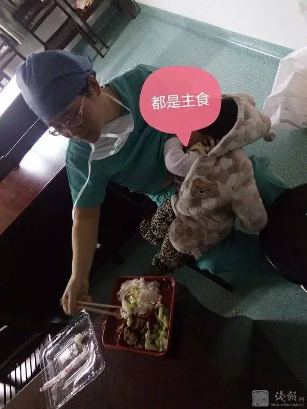 手术结束后,宣敏芝赶紧跑到办公室,一手接过早已饿哭的宝宝哺乳,丈夫也赶紧把凉透的饭菜送到宣敏芝面前。