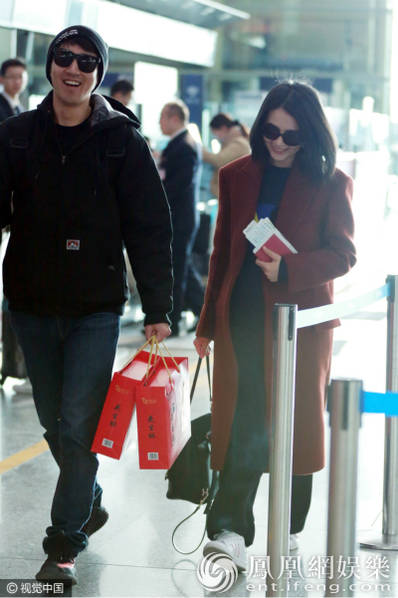 1月24日,高圆圆、赵又廷夫妇满载年货现身机场,看来是要夫妻双双把家还,回台北过新年。高圆圆一身枣红色大衣,星味十足,她自推行李十分低调。 老公赵又廷手里满载红彤彤的礼盒,不过安检时他当众系鞋带,毫无偶像包袱。