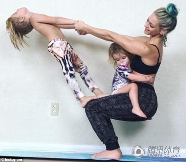 照片中,她做着幻椅式动作,即想象自己坐在椅子上的姿势,费利西站在妈妈的大腿上,伸展着身体,十分可爱;还有一张照片,查丽蒂做着手倒立的姿势,亲吻着女儿,体现了力与美的结合。
