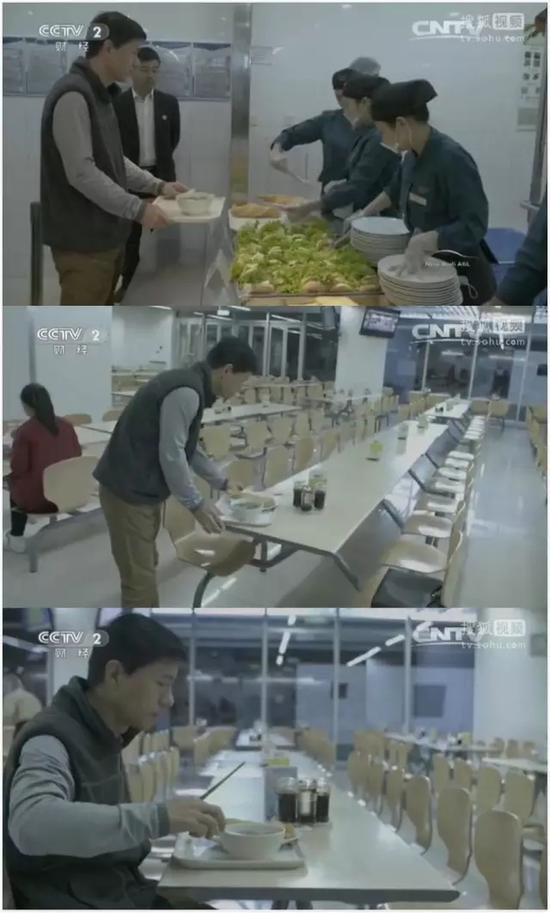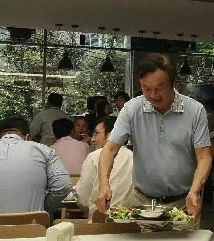 图中就是领到餐后,任正非一个人端着盘子去吃饭的画面。可以看到,任正非的盘中以素菜为主,看起来心情很不错。