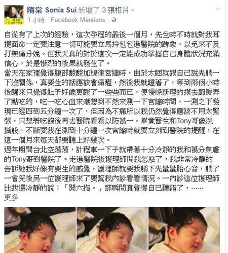 隋棠因为到医院内诊时,已经开6公分,因此来不及打无痛分娩,她说后来过程“实在没有文字可以形容”,只记得自己只能专心努力地生,因为那种疼痛是多一秒就像要命似的,连老公想帮她整理脸上被汗浸湿的发丝,也遭她怒吼:“可不可以不要一直碰我的脸,很烦!”