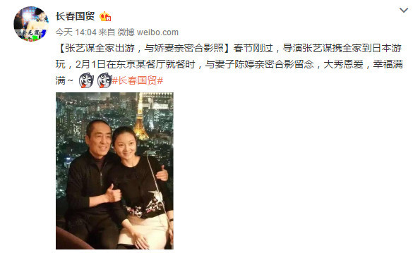 腾讯娱乐讯 2月4日下午,博主“长春国贸”在微博晒出张艺谋与妻子的合影。他写道:“春节刚过,导演张艺谋携全家到日本游玩,2月1日在东京某餐厅就餐时,与妻子陈婷亲密合影留念,大秀恩爱,幸福满满。”