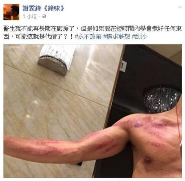 其实谢霆锋受伤的伤痕是练习厨艺所致,他在社交网站上晒照解释说:“医生说不能再长期在厨房了,但是如果要在短时间内学会煮好任何东西,可能这就是代价了?!”