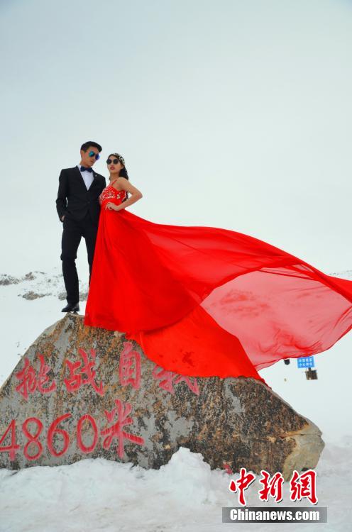 【最扛冻的秀恩爱】位于四川阿坝州黑水县的达古冰山景区在四月迎来了雪景与山花交织的绝色美景。2016年4月23-24日,6对情侣在海拔4860米的达古冰山之巅,许下爱情诺言,定格永恒瞬间。 中新社记者 庄媛 摄