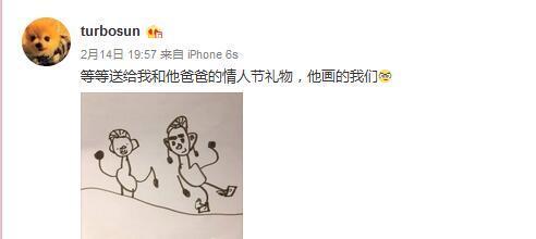 腾讯娱乐讯 2月14日晚孙俪更新微博,晒出一张儿子画的她和邓超的画像,孙俪配文写道“等等送给我和他爸爸的情人节礼物,他画的我们。”