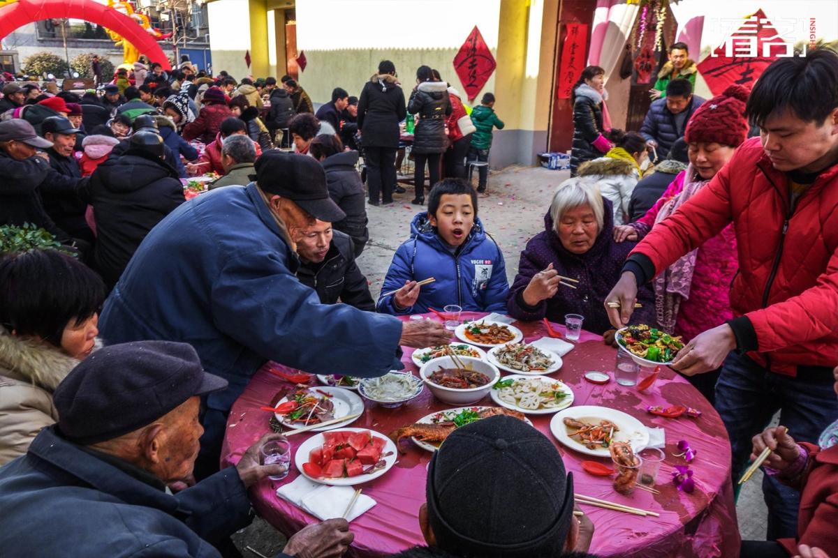 2017年1月23日,安徽省淮北市,杜集区段园镇一户农村人家娶儿媳妇,按照皖北风俗,酒席一般是“三八八”大席,也就是八个凉盘子八个炒菜和八个烧菜,家里不富裕一般都是“三六六”。吴克涛/视觉中国