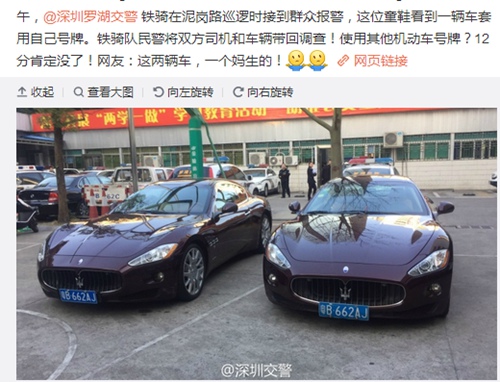 两辆玛莎拉蒂撞脸。深圳一名玛莎拉蒂车主向市交警局举报称其车辆遭套牌,并将套牌车司机“活捉”。15日下午,罗湖交警大队民警接报赶到现场后,却发现举报者的车也有问题,遂将两辆车予以暂扣。而两辆车车牌都显示是制证部门合法制作,一时让办案民警也云里雾里。因涉嫌套牌车车主尚未到案,目前此案还在调查中。