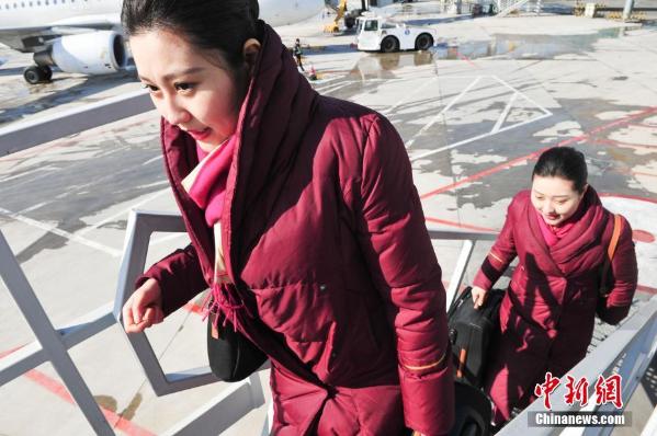 2月17日,辽宁沈阳,姐姐贾冰(左一)妹妹贾雪走员工通道上飞机。这对来自沈阳94年的姐妹花,在南航北方分公司工作一年有余,其间难得有机会一起执行航班,在春运接近尾声之际,姐妹花联袂执行航班服务春运。 中新社记者 于海洋 摄
