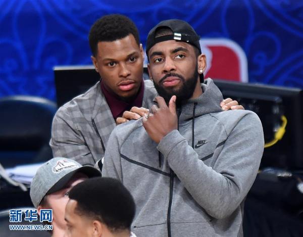 2月17日,多伦多猛龙队球员洛瑞(左)和克利夫兰骑士队球员欧文观看新秀挑战赛。当日,在2016-2017赛季NBA全明星周末新秀挑战赛中,世界队以150比141战胜美国队。 新华社记者鲍丹丹摄