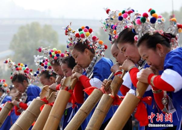 2月18日,广西三江侗族自治县举行第二届芦笙节,32支芦笙队900多人同台比拼吹芦笙技艺。参赛人员穿着少数民族服饰,吹响嘹亮的芦笙,跳起芦笙舞,大展民族风情。 侗族女子在吹地筒。吴练勋 摄