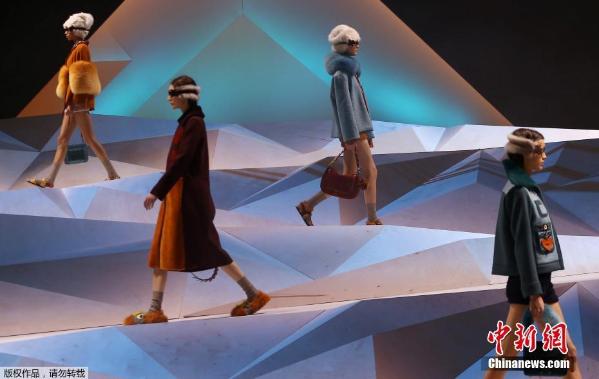 当地时间2月19日,伦敦时装周上,模特行走于台上。Anya Hindmarch品牌专场将T台重新设计,打破了以往观众的视觉体验。到底舞台是平面还是立体,让人看得眼花缭乱。