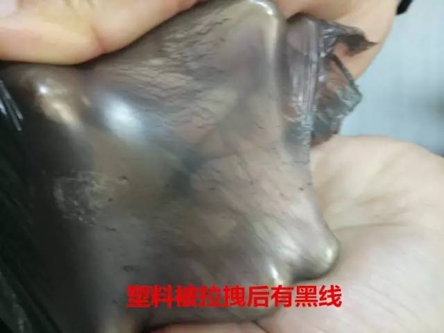 其实,如果塑料不浸水,差别更明显:塑料被拉拽后会有一道道黑线,不像紫菜那么透明均匀。
