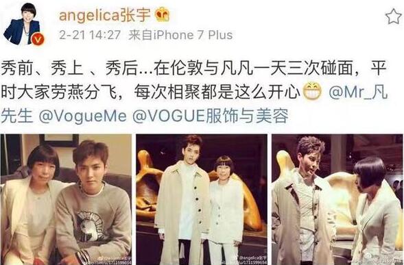 搜狐娱乐讯 2月21日,《VOGUE》中国版主编张宇在微博晒出一组与吴亦凡在伦敦时装周的合照,并写道:“秀前、秀上、秀后。。。与凡凡在伦敦一天三次碰面…平时大家各有各忙,但每次相聚都是这么开心自然。”照片中,两人穿着休闲,开心合影。