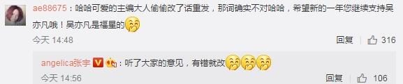 不过有网友发现,这是张宇发出的第二条微博。原本微博文字为“平时大家劳燕分飞,但每次相聚都是这么开心自然”而劳燕分飞在此处用的不当,张宇在听从了网友建议后删掉并重新编辑了第二条,在评论区虚心表示:“听了大家的意见,有错就改。”