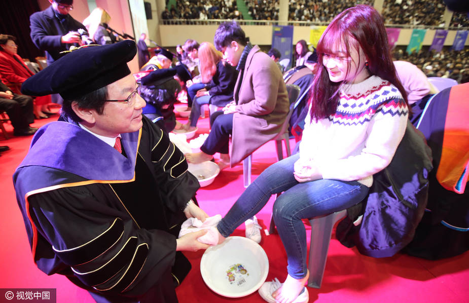 韩校长为新生洗脚。2017年2月21日报道,韩国釜山,东西大学的入学仪式上,校长和教授们亲自为新生洗脚,以表达对学生的关爱。来源:视觉中国