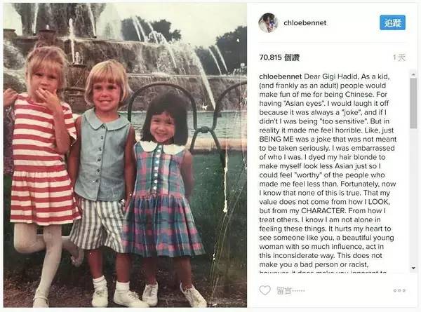 她发了一条Ins,向Gigi喊话,表达了对这位超模的失望,也呼吁亚裔们勇敢做自己!