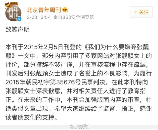 2月23日,张靓颖分享了的道歉声明,写道:“两年了,感谢法律的公正!当初出于为符合法律条款的起诉要求,才将周刊列于被告。但我的个人诉求从来只针对于这位‘相关工作人员’,笔名为‘张纳’的编辑。针对的内容并非转载部分,而是她利用贵刊的公共平台,肆意诋毁的个人言论部分。感谢你们为张纳的个人行为表达的歉意! ”(禾失)