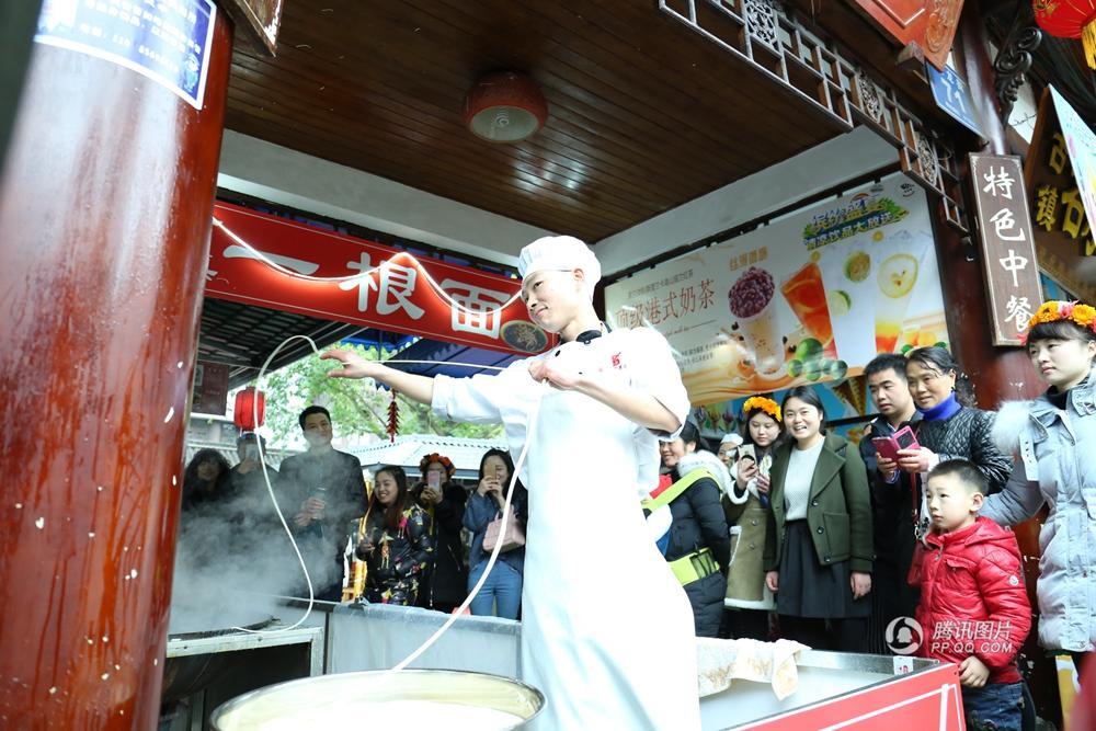 2月22日,成都一拉面小哥边拉面边表演,表情夸张、动作妖娆,引得众多游客围观。视觉中国