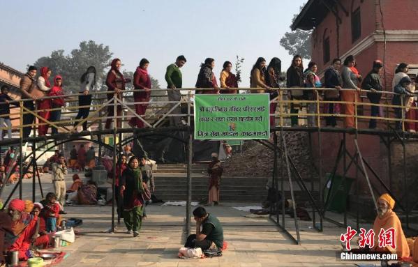 2月24日,印度教湿婆节。尼泊尔帕斯帕提那神庙(俗称“烧尸庙”)作为湿婆神的主神庙,预计将迎130万来自印度、尼泊尔等国家的印度教信众。图为等待进庙祈福的印度教信众。中新社记者 张晨翼 摄