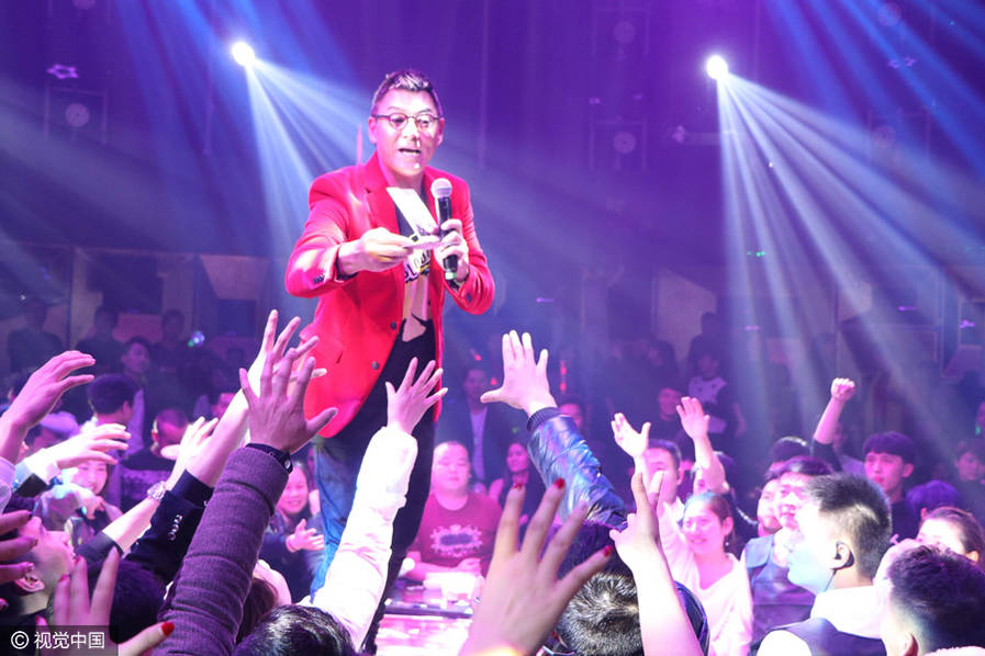 2月24日晚,55岁的香港影星莫少聪现身湖北宜昌一商业中心酒吧,受到影迷夹道欢迎,演唱了《你是如此难以忘记》、《与你相逢》等歌曲,还动情演唱了刘德华的《忘情水》。年过半百的他为粉丝送照片、送唱片,还为热情买酒的影迷颁酒。(图文/视觉中国)