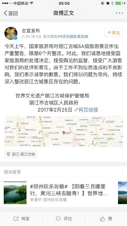 2月25日,丽江古城景区被国家旅游局严重警告后,古城区委宣传部在其官方微博@古宣发布 表态,诚恳地接受国家旅游局的处理决定,接受舆论的监督,接受广大游客的批评和意见。