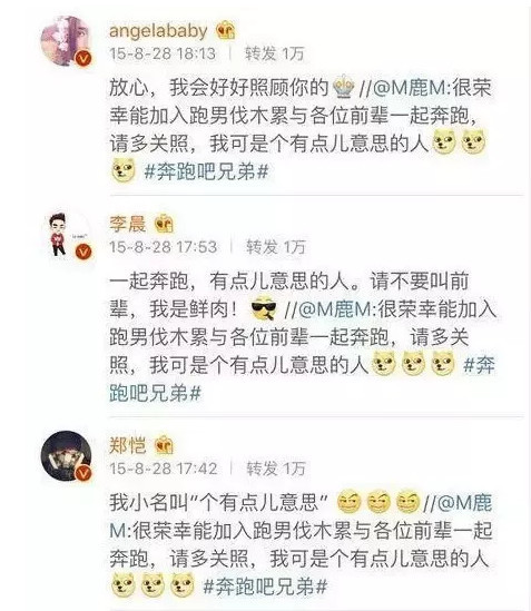 就连人气王鹿晗加入跑男第三季时,成员们虽热烈欢迎,但在早期节目中,玩撕名牌鹿晗总是第一个被撕,和跑男成员交流很少,大家玩游戏也都不怎么带着他,在成员间存在感相当弱。