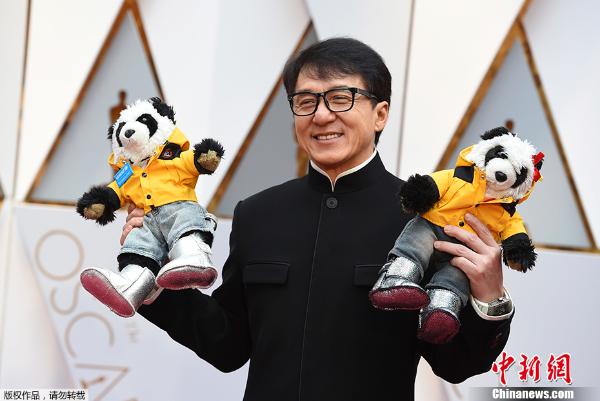 当地时间2017年2月26日,第89届奥斯卡颁奖礼(89th Annual Academy Awards)在美国洛杉矶杜比剧院举行,明星大腕云集红毯。图为成龙手举两只大熊猫玩偶亮相。